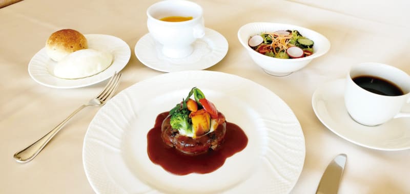 おすすめは「森のハンバーグランチ」。甲州ワインビーフと富士桜ポークのハンバーグステーキが味わえる贅沢な一品です。セットには旬野菜のサラダやポタージュなどもついてきます。味はもちろん、見た目も華やかで、旅ならではの贅沢なランチを味わいたい人におすすめ!