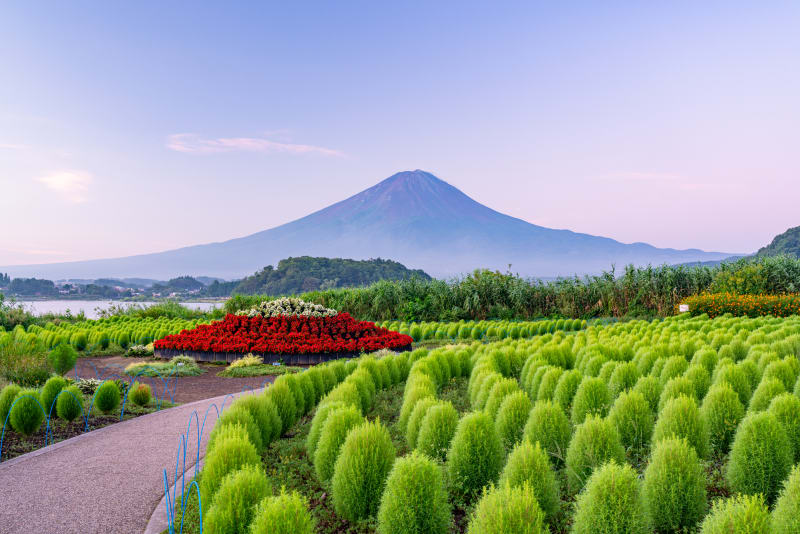 『大石公園』は、雄大な富士山と河口湖を一度に眺められる絶景スポット。湖畔の遊歩道には、90種類以上もの花木が植えられており、四季折々の景色が広がります。