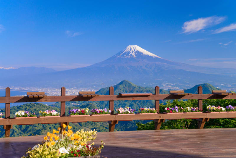 山頂の展望台に到着すると、目の前には富士山の大パノラマが。裾野が広がる圧倒的な富士山のスケールに感動すること間違いなし!