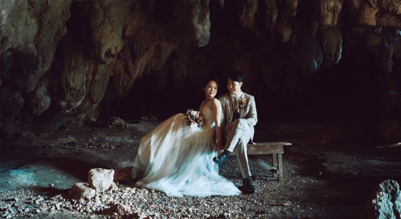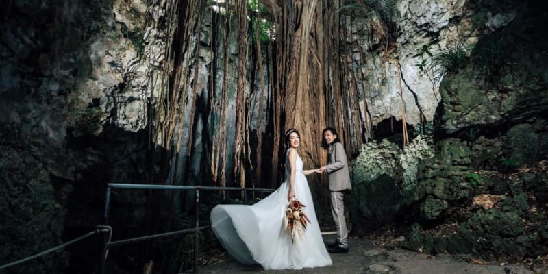 今もなお枝を伸ばし続ける大主ガジュマルのそばでは、伸びやかな表情で生命力あふれる1枚を。撮影と一緒に、良縁・安産などの願いをささげる「イキガ洞」でふたりの末永い幸せを祈りましょう。