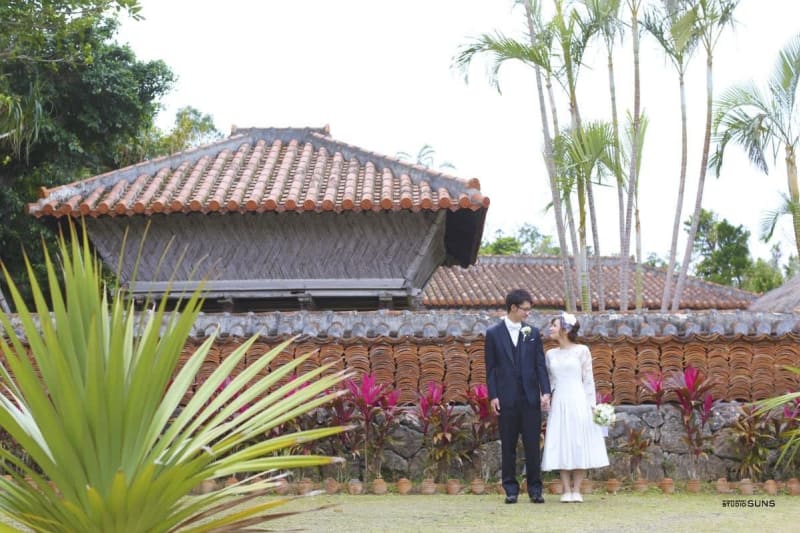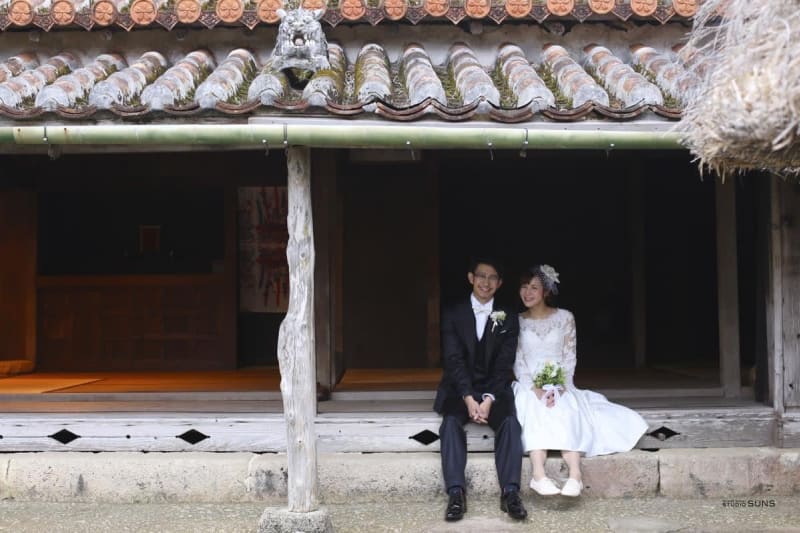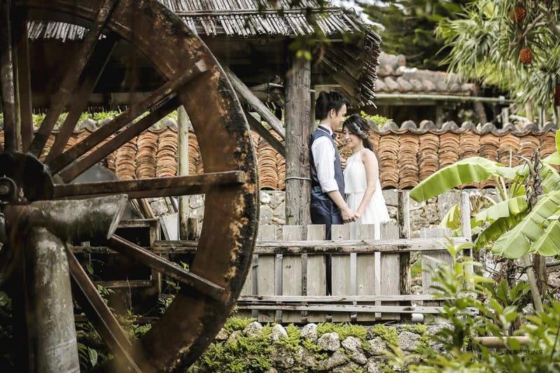 歴史ある古民家の軒先で、ふたり寄り添って座る1枚。赤瓦屋根に水車、シーサーなどがあちらこちらにあり、どこで撮影しても絵になる写真を残せます。