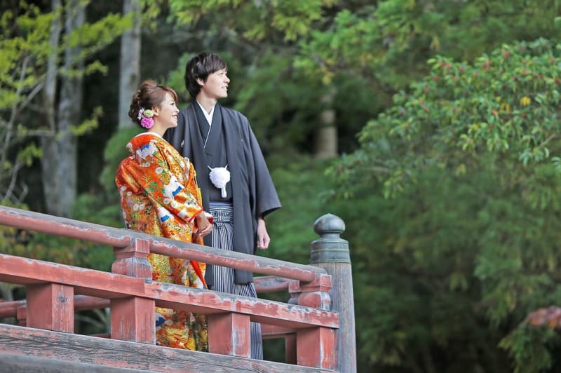 緑のなかに映える三重塔を背景に撮影すれば、自然の豊かな色合いがふたりの和装姿を美しく引き立ててくれます。