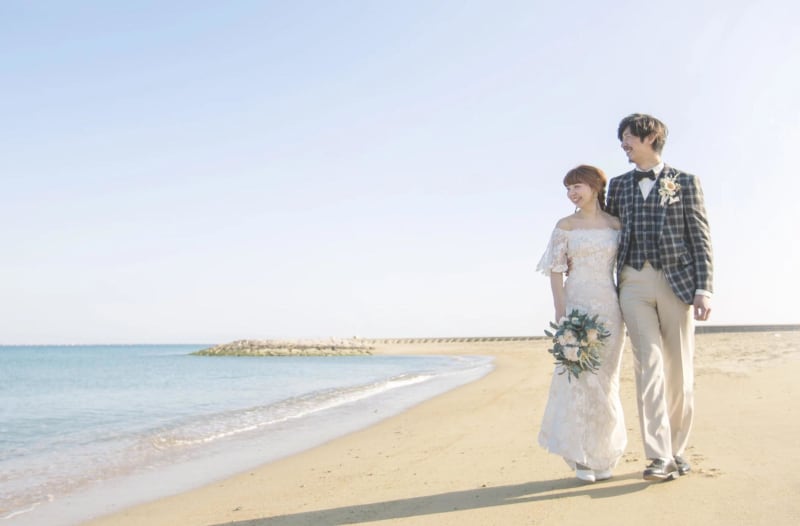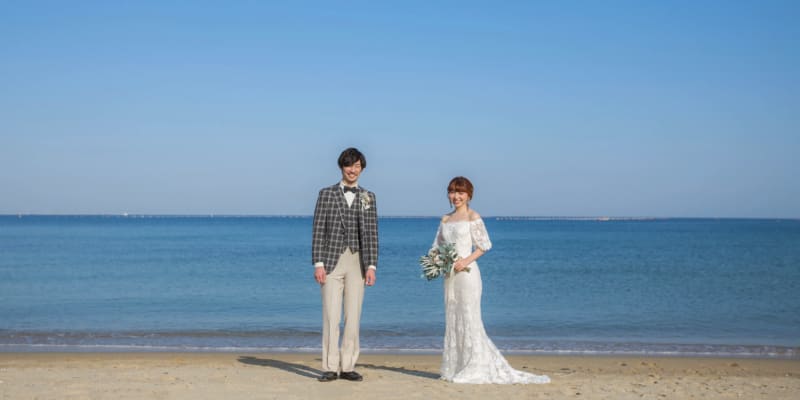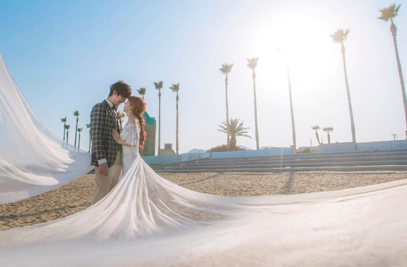 フォトウェディングでは、輝く砂浜でドレスのベールをなびかせ、開放感ある1枚を撮影してみて。