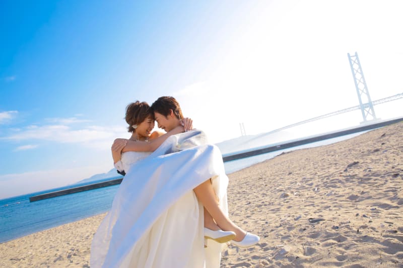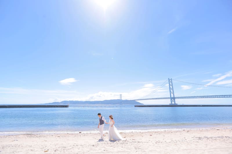 日本最大級の吊り橋がすぐ側に迫った『舞子浜』では、迫力のあるビーチフォトが撮影できます。