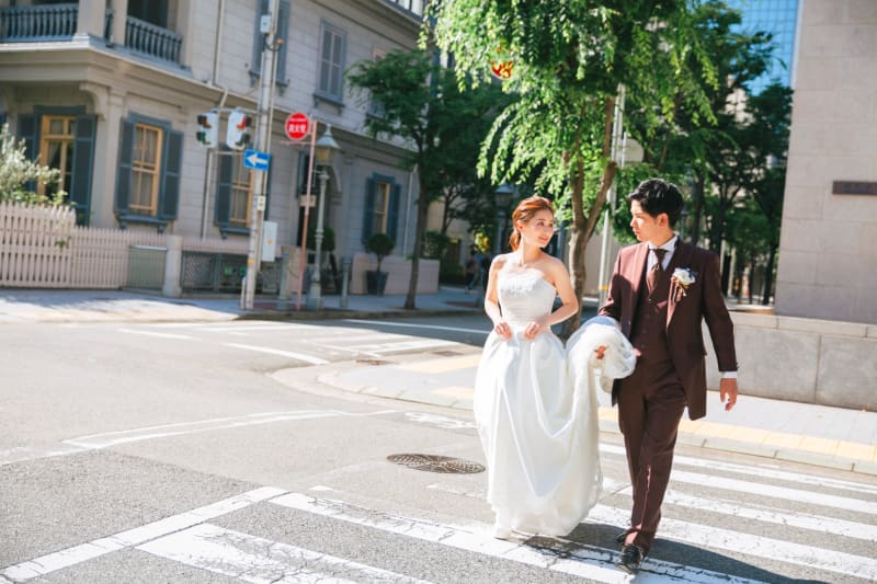 衣装はタキシードやドレスなどのスマートな装いがおすすめ! SNS映え必須なレトロなビルは、コロニアル様式やイオニア式など、建物によっても特徴がさまざまなので、お気に入りの建物を事前にチェックしておくのが良いですよ。