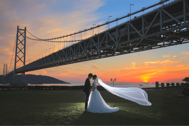 夕暮れ時には、ふたりで向かい合うドラマチックな1枚を。絵画のように色合いが豊かで、ほかでは撮影できないオリジナルな写真を撮影できますよ。