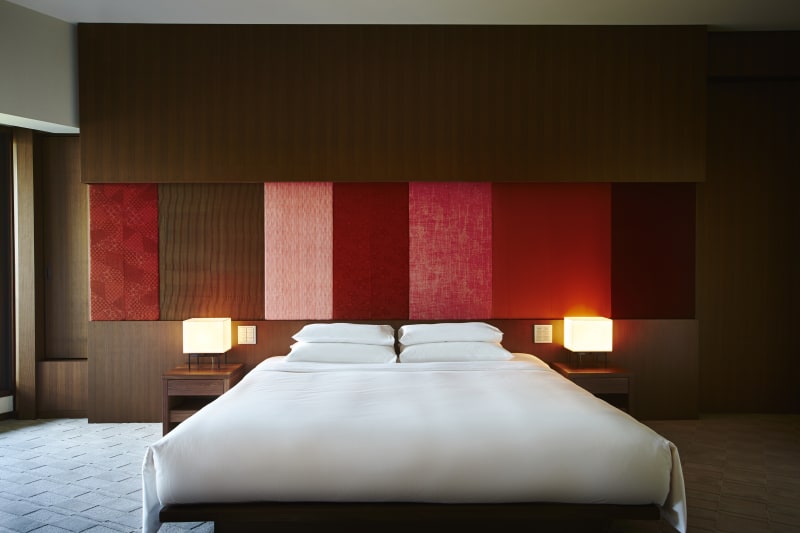 187室の客室には、行燈や着物柄のヘッドボードなど、お部屋のいたるところに京都らしい美しいデザインがあしらわれています。