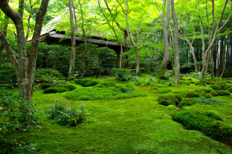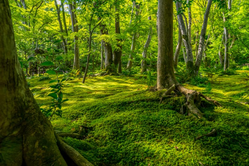 境内は竹林や苔、青もみじに覆われており、どこまでも緑深い景色が広がっています。背筋が伸びるような荘厳な雰囲気。