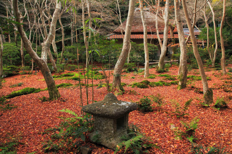 侘び寂びをイメージさせる、庵内から覗く青もみじの景色も見ごたえ抜群! 秋の空一面が赤く染まる紅葉も圧巻です。