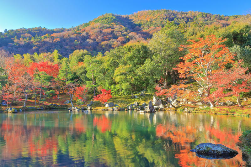 天龍寺の見どころは、嵐山を借景にして作られている曹源池庭園。自然を上手く取り入れながら作庭されており、雄大な自然をありのままに感じることができます。