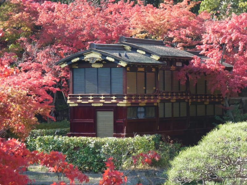 相楽園を象徴する「船屋形」と鮮やかな紅葉とのコラボレーションも見ごたえバツグン。金箔をあしらった豪華な屋形船が、紅葉に囲まれてより一層美しく輝きます♪