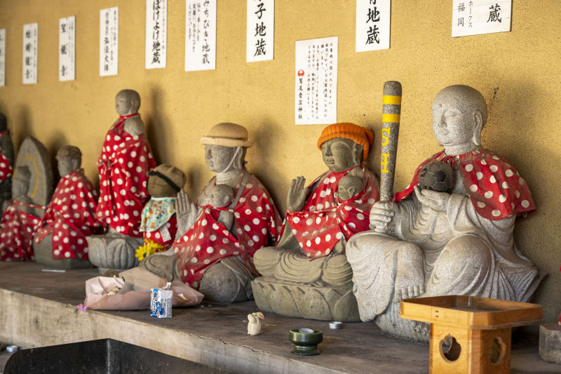 鷲尾愛宕神社の境内には17体ものお地蔵様が並んでいます。その中には野球バットを持って、野球を応援している可愛らしいお地蔵様の姿も。