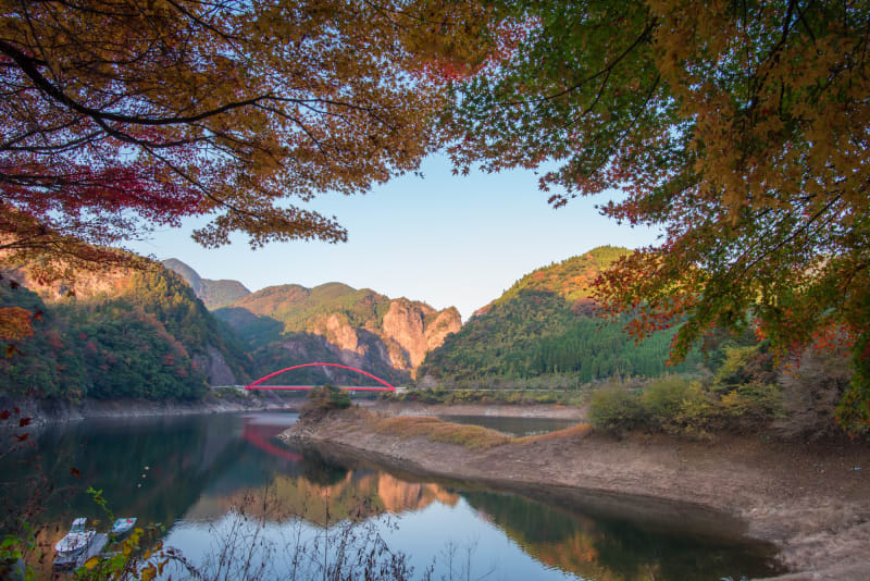 日向神峡は四季折々の自然にあふれており、とくに秋は福岡県で最も標高が高い釈迦岳から美しい紅葉を眺められます。