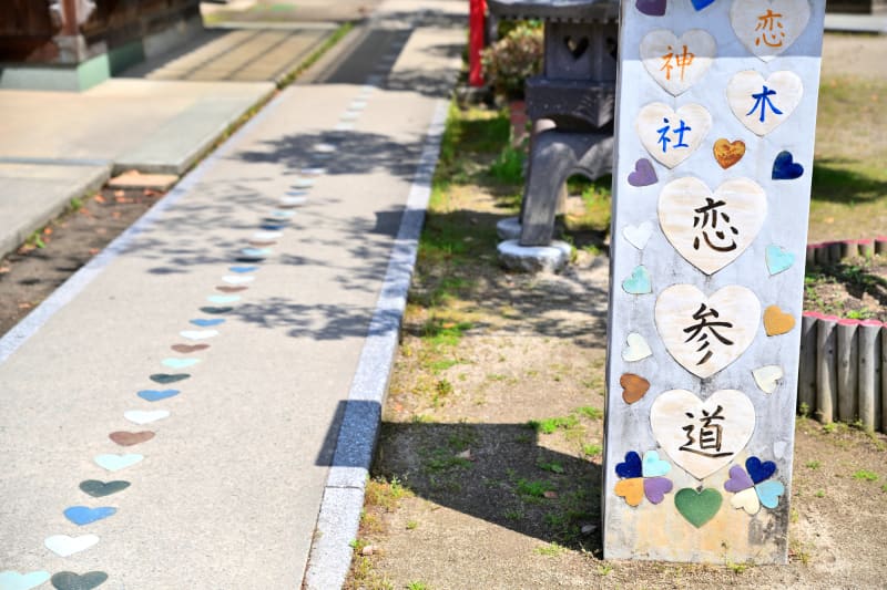 恋木神社へと続く「恋参道」にはハートの石が埋め込まれており、フォトスポットとして人気。恋愛成就の願いが込められた恋木鳥居には10個ものハートが施されています。