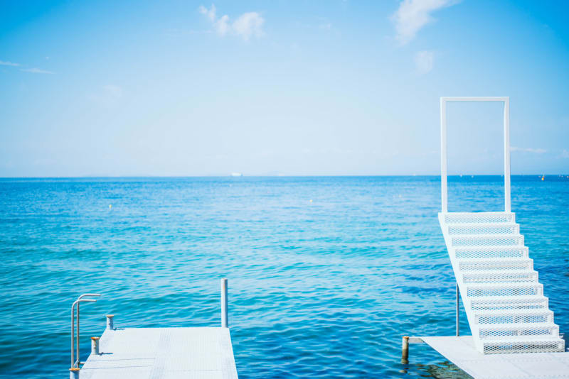 海に突き出すように設置された「幸せの階段」は、海や空に吸い込まれるような感覚を味わえるフォトスポット。夕暮れ時になると、シルエット調の雰囲気ある写真を撮影できます。階段の頂上で、ふたり並んで美しい夕日を眺めるのも素敵!