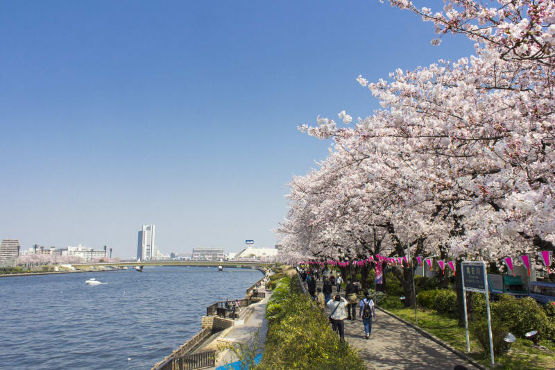 隅田公園、隅田川に隣接しているため、季節ごとの美しい自然を楽しむことも。キラキラ光る水面を眺めながら、ゆったりとお散歩したり、東京ミズマチ®でパンやコーヒーをテイクアウトしてピクニックするのもおすすめですよ。