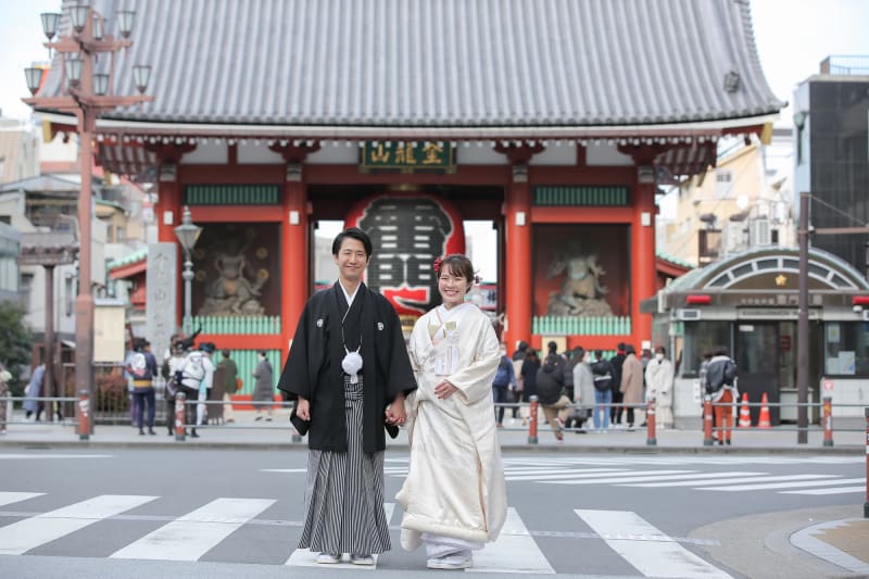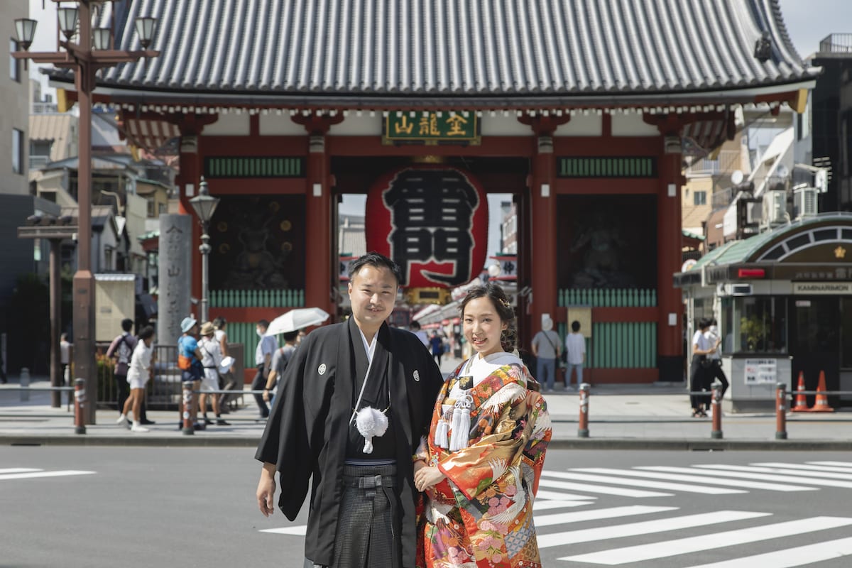 風神と雷神像がある雷門は、浅草のランドマーク的存在で、撮影スポットとしても大人気です。まずは門の前でふたりで記念撮影を楽しみましょう!