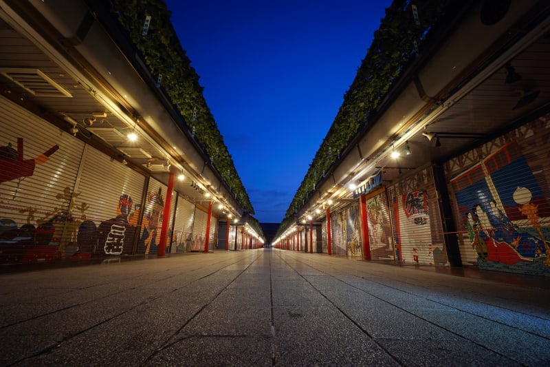 また、仲見世通りは昼間だけでなく夜も魅力的。「浅草絵巻」と題し、全店のシャッターに浅草の歳事が描かれています。