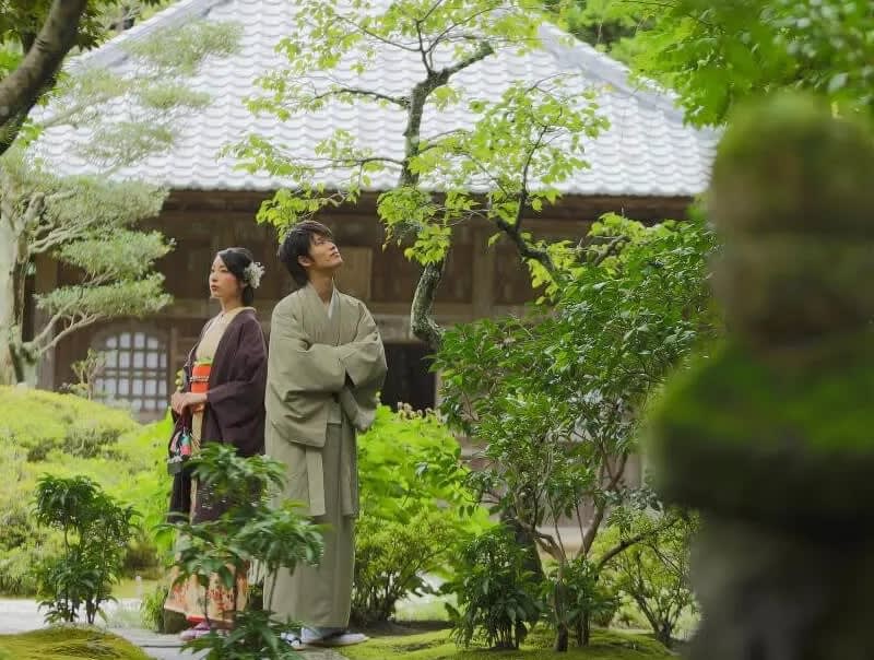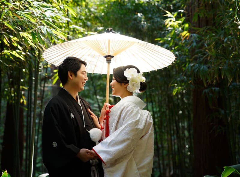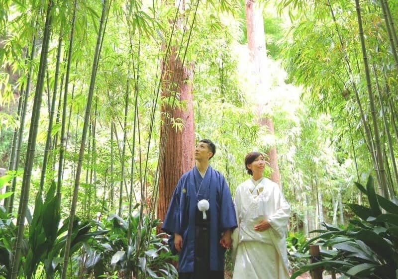苔むした参道の階段や竹林など、緑を存分に感じられる古寺『浄智寺』。しっとりとした雰囲気に包まれながら、爽やかなフォトウェディングを撮影できるスポットです♪