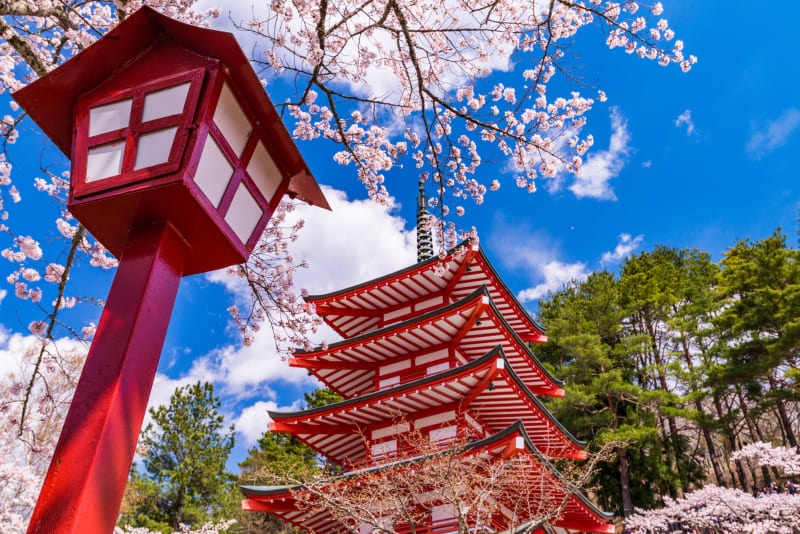 山の麓の『新倉山浅間神社』は、災除け・家庭円満の御利益があるスポット。ふたりの末永い幸せを祈りに訪れてみては。鳥居越しに見える富士山の姿も見逃せません!