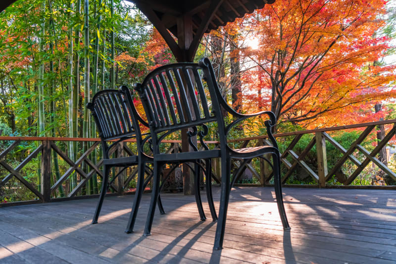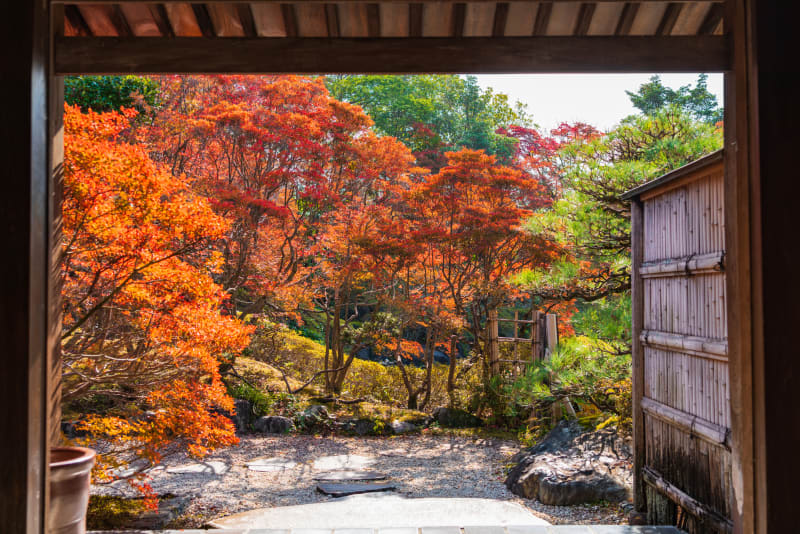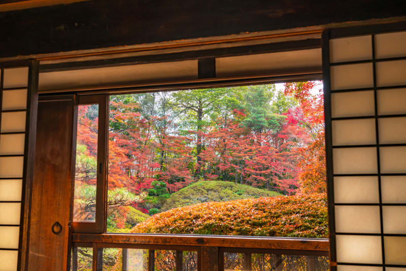 また母屋のなかに入ることもでき、縁側に座れば庭園の紅葉をじっくりと鑑賞できます。一般公開の期間中は、畳敷きの和室でお茶とお菓子をいただける日も。