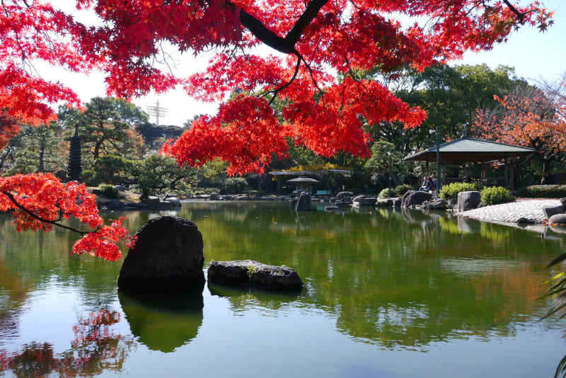 蝶が羽を広げた形を模した『胡蝶ヶ池』、池に架かる『鈴菜橋』も必見の紅葉ビュースポット。自然豊かな園内を散策しながら、水鏡に映し出された鮮やかな紅葉を鑑賞してみて。
