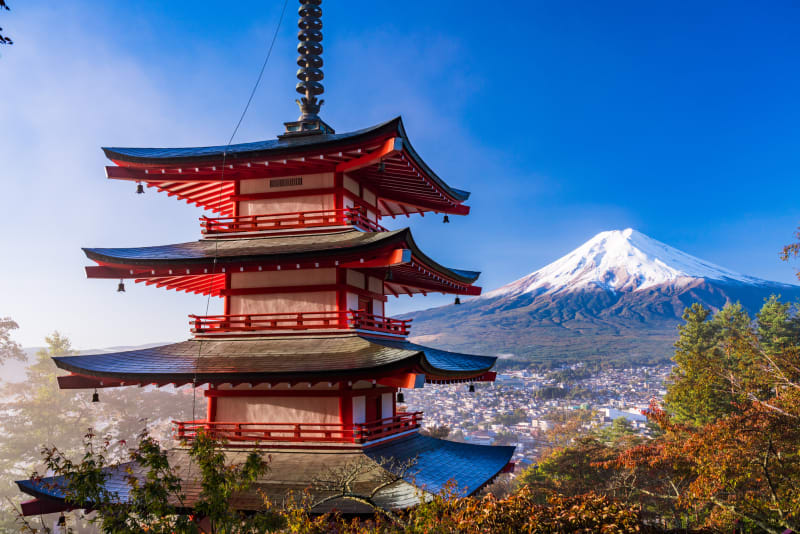 山梨県富士吉田市、新倉山の中腹にある『新倉山浅間公園』。五重塔越しに富士山を眺められる有名なビュースポットです。