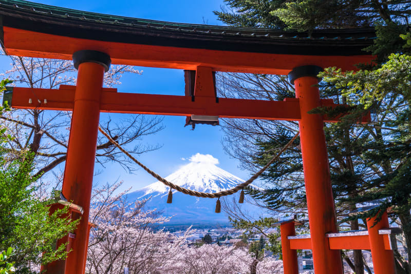 山の麓にある新倉山浅間神社は、災除け・家庭円満の御利益がある神社です。園内の散策と一緒にぜひ立ち寄ってみては。