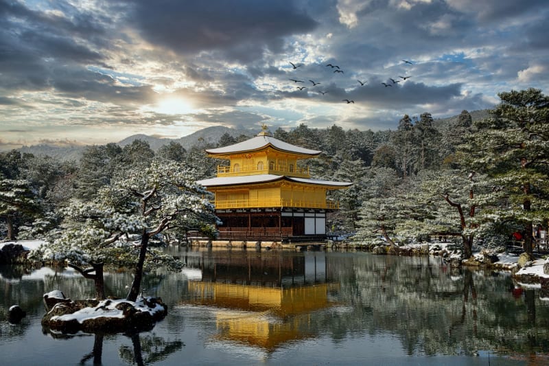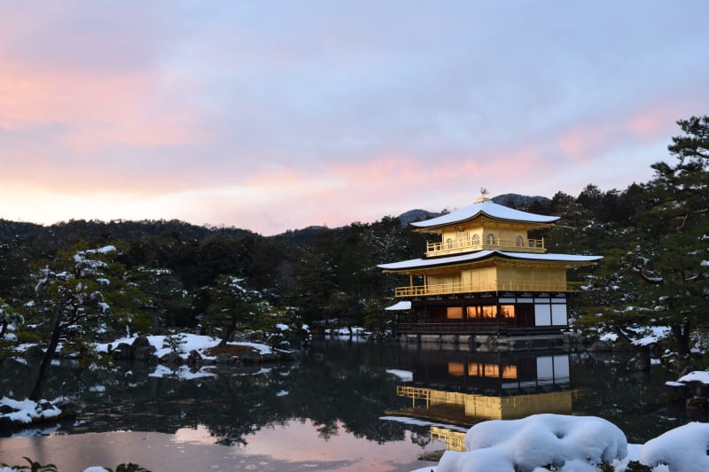 新緑や紅葉に囲まれる金閣寺も美しいですが、雪景色に映える金閣寺も必見です。