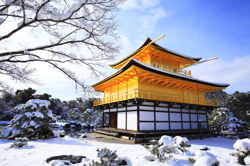 冬ならではの、雪化粧の金閣寺を見ることも。金箔のお寺に真っ白な雪が降り積もる景色は、まさしく冬だけの絶景です。金閣寺の周りの木々も白く染まり、より一層、豪華絢爛な姿が黄金に輝きます。