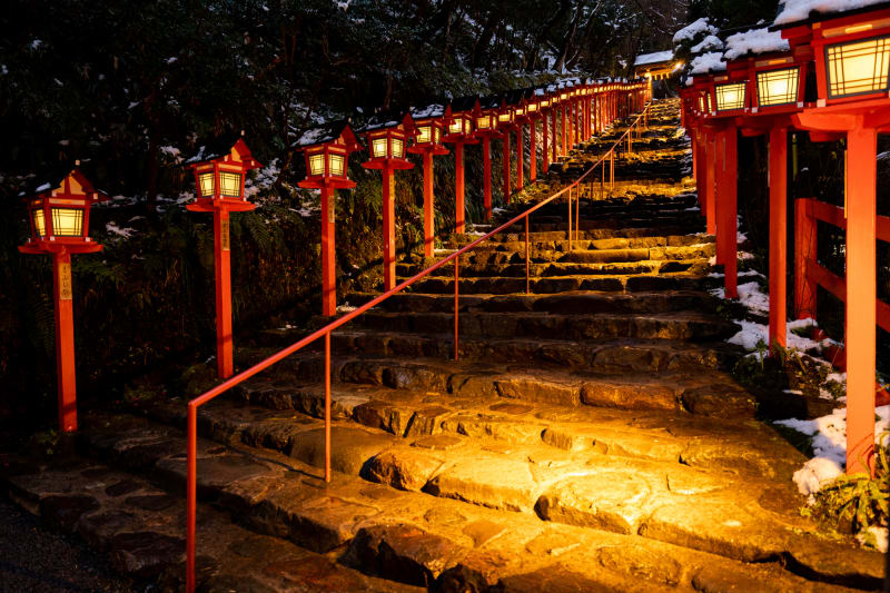 本宮へと繋がる赤い灯篭が並ぶ参道も見どころです。石畳の参道とその脇に並ぶ赤い灯篭が雪化粧をしている様子は、写真映え抜群。積雪日限定のライトアップもされますよ♪