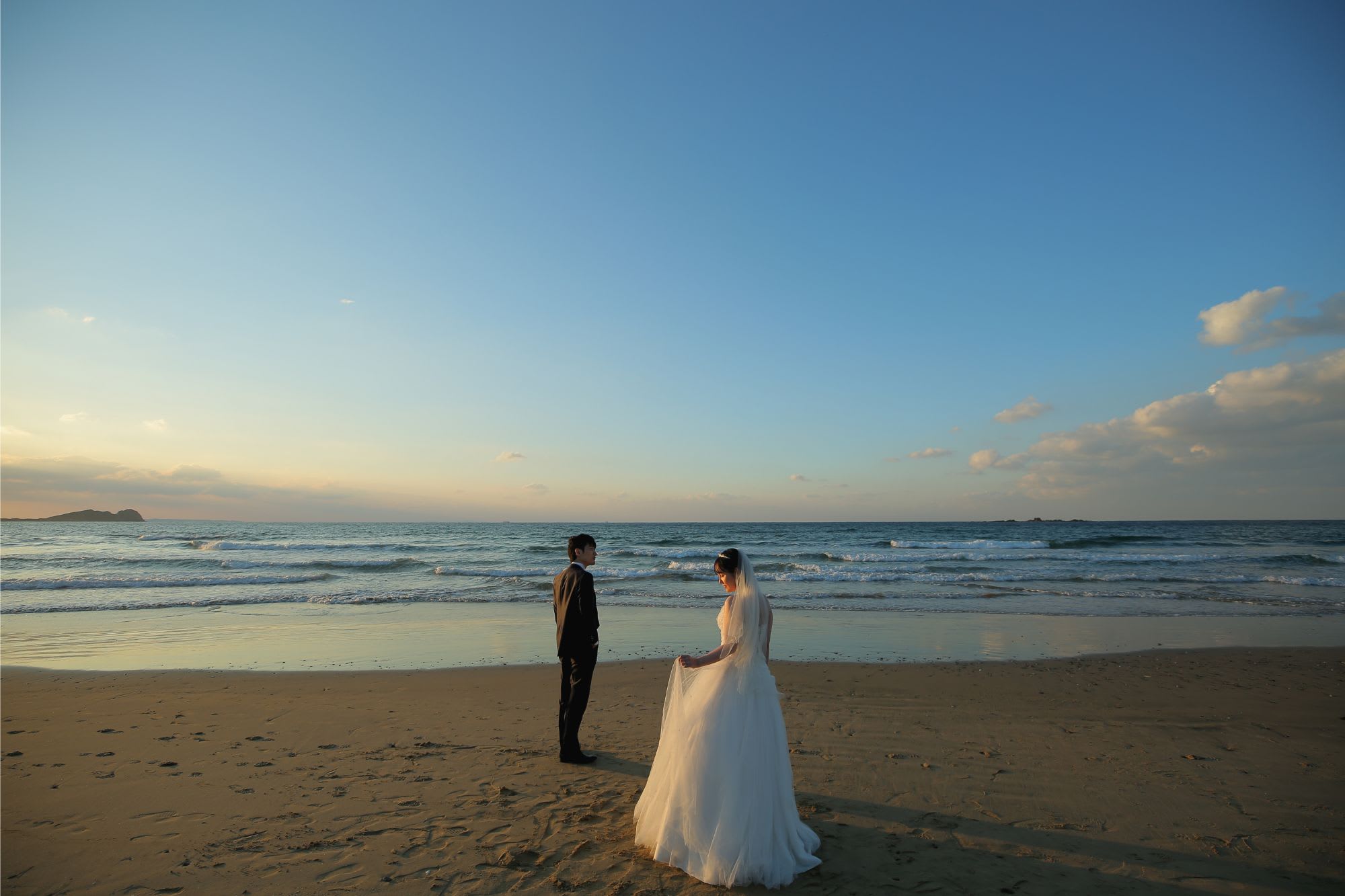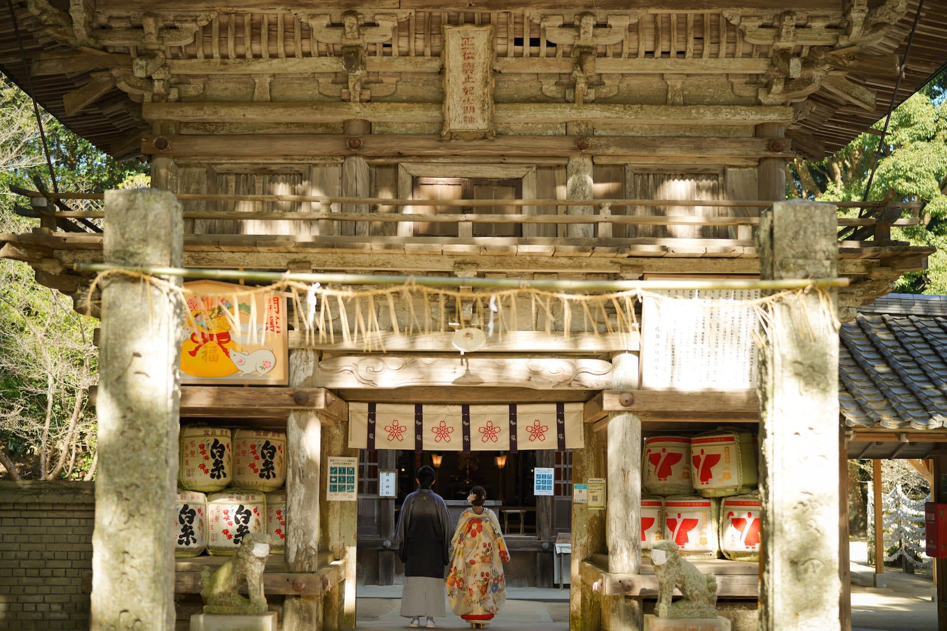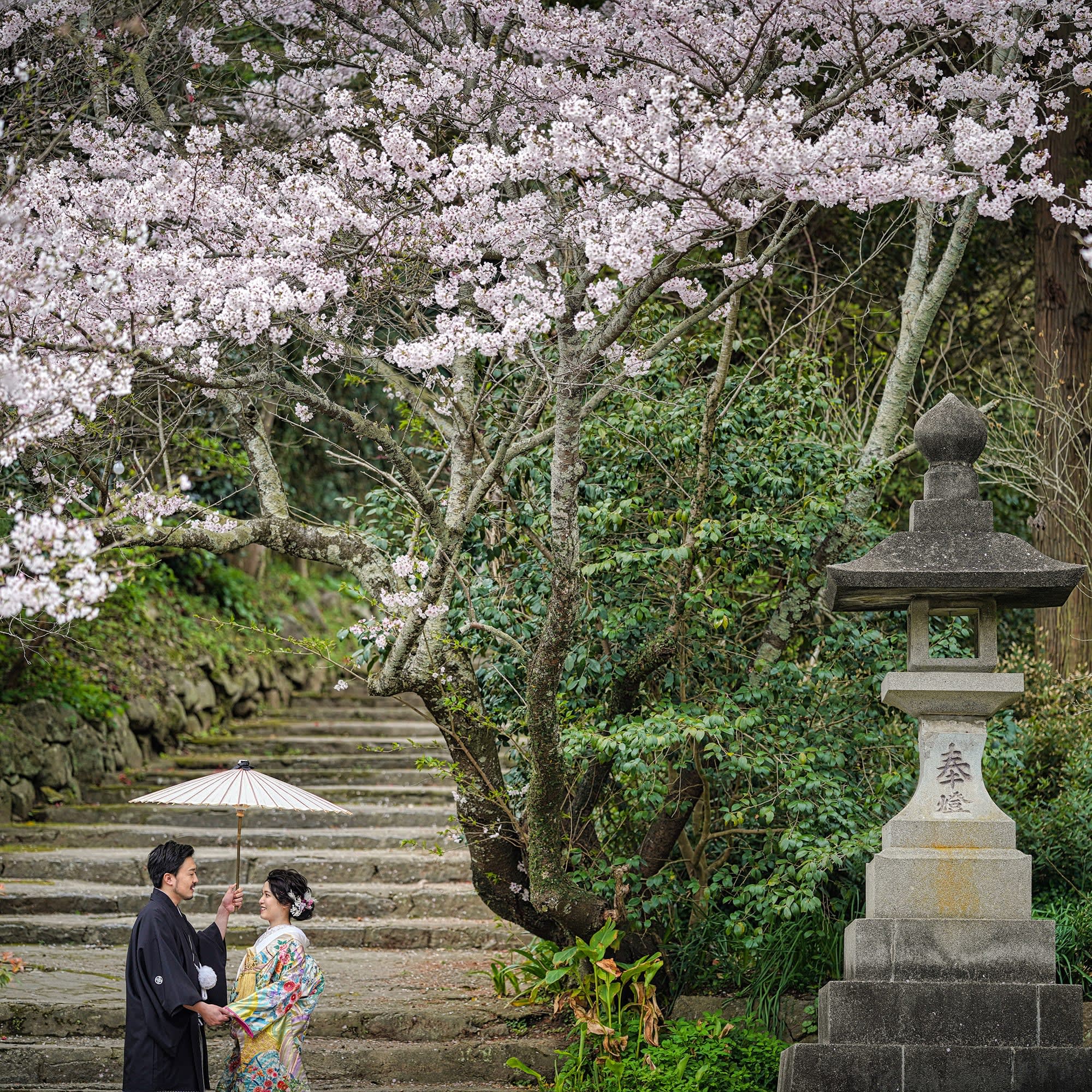 糸島北部の海岸にある『桜井二見ヶ浦 夫婦岩』。日本の渚百選・日本夕日百選にも選ばれており、鳥居越しに見える海に浮かぶ2つの巨大な岩「夫婦岩」は、縁結びのパワースポットとしても有名です。