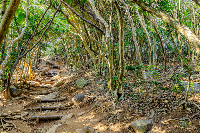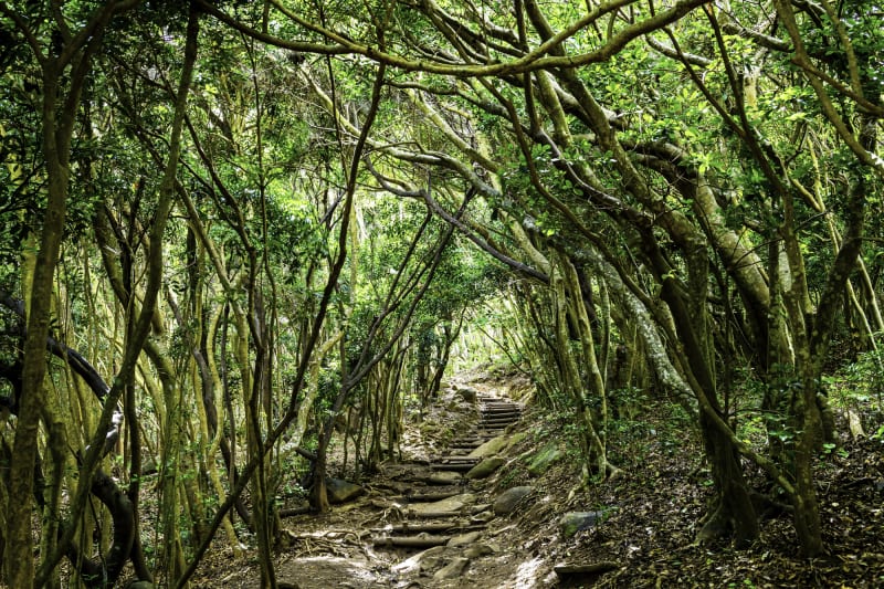 ヤブツバキなどの木々が遊歩道に覆い被さるように生えているのが特徴。自然が創り出したトンネル道は、一歩足を踏み入れると高揚感に包まれます。