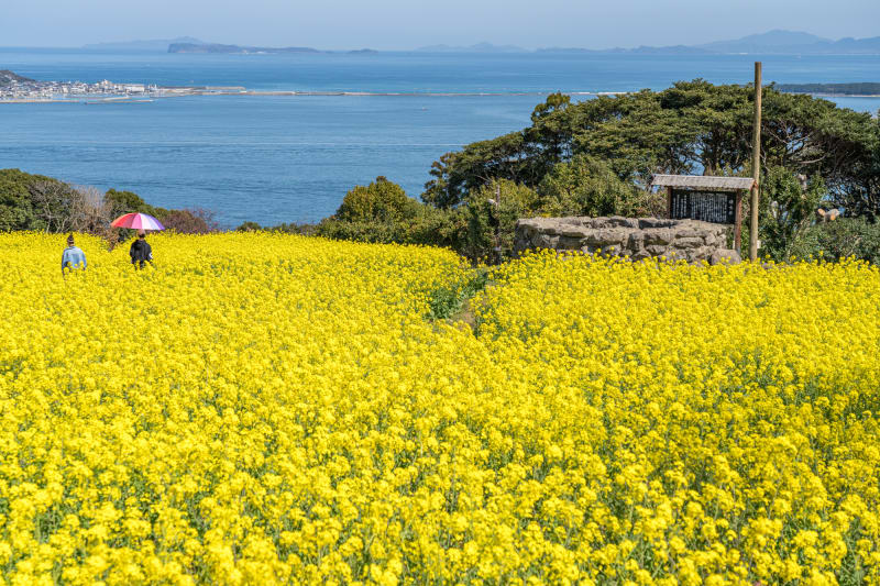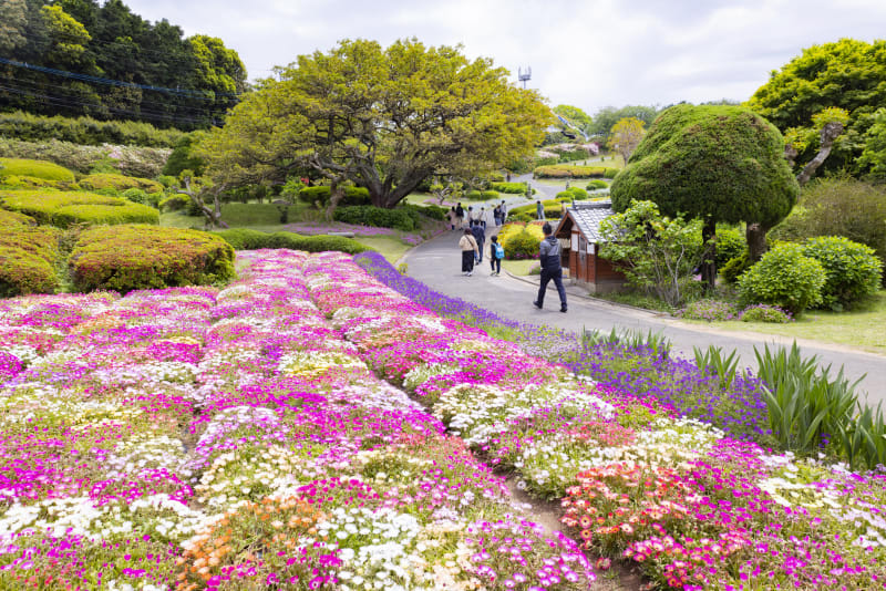 広い園内にはさまざまな花が植えられており、春の桜や菜の花、夏のひまわり、秋のコスモス、冬の水仙やオキザリスなど四季折々の自然を満喫できるのが魅力。海を背景に一面に広がる花畑は絶景で、写真を撮らずにはいられません!