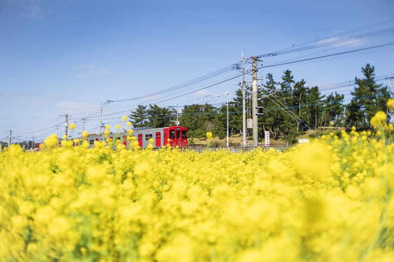 菜の花と電車のコラボレーションは、ここでしか見られない景色。春には、駐車場に河津桜が咲き、黄色い菜の花と薄ピンクの桜のコントラストも楽しめます。