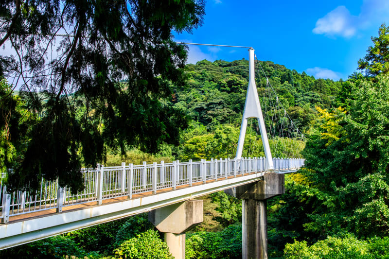 加茂川上流にかかる一本のワイヤーで吊られた『加茂ゆらりんこ橋』。名前には「ゆらりんこ」とありますが、ほとんど揺れることのない安定感のある橋です。