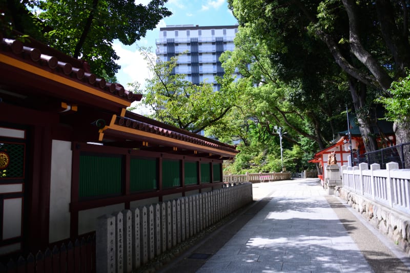 本殿を参拝したあとは、そのまま奥まで進んで通称「生田の森」へ。木々が生い茂る森を進むと、枕草子にも登場した「生田坐杜」が見えてきます。