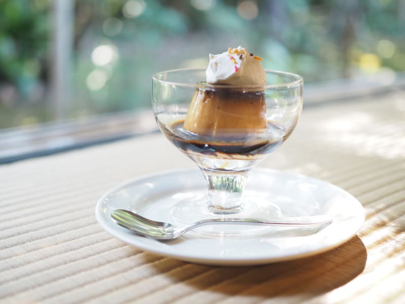 店内は、まるで料亭のような落ち着いたたたずまい。お座敷や大きな窓越しに見える緑豊かな自然など、心安らぐ空間で絶品スイーツを味わえるのが魅力です。