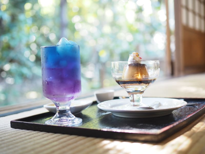 創業当時から提供している「自家製プリン」と鎌倉らしい鮮やかな色合いが魅力の「あじさいレモネード」。濃厚な味わいで見た目も可愛らしい一品です。