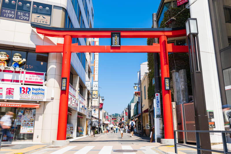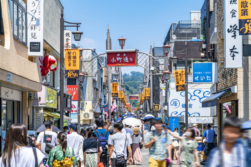JR鎌倉駅東口に出ると見える大きな鳥居が、小町通りへの入り口。今話題のカフェやグルメ、おしゃれなショップが立ち並んでいます。
