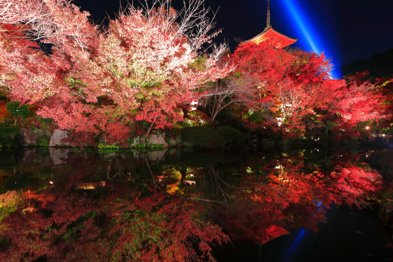 境内で最も有名な「清水の舞台」からは、春には桜、秋には紅葉の美しさを堪能でき、シーズン中は夜間のライトアップが実施されます。