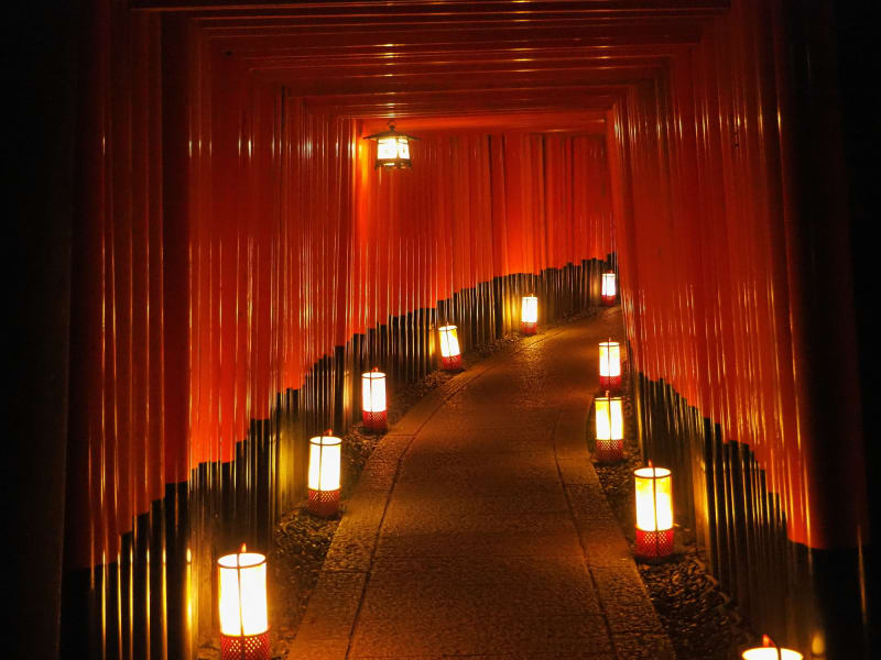 また伏見稲荷大社は、夜のデートにもぴったり。24時間開放されているので、暗くなってからの到着でも大丈夫。千本鳥居が夜空に浮かび上がり、昼間とは違った幻想的なムードに包まれます。