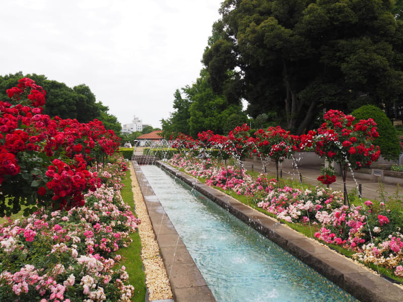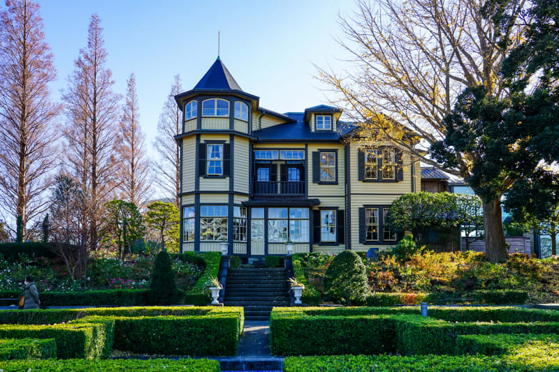 園内には『外交官の家』と『ブラフ18番館』があり、西洋館めぐりには欠かせないスポット。春と秋には、美しいバラも鑑賞できます。
