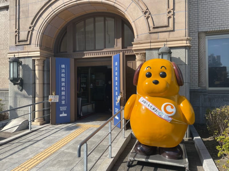 横浜税関入り口では、麻薬探知犬をモデルとしたマスコットキャラクター『カスタム君』がお出迎え。館内では、横浜税関の歴史や貿易史、各種取締り、押収品などが展示されています。