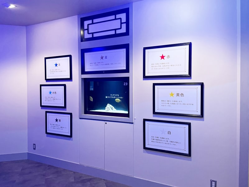 水槽の中には、勇気・元気が出る言葉や生きるヒントなどが書かれており、色鮮やかな魚たちが“開運魚”として来館者をお出迎え。