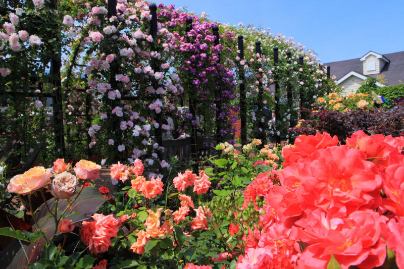一番の見どころは、春秋に見頃を迎える約2,200品種2,800株のバラ。5月にはローズ・トンネルが見事なバラで飾られ、可憐な花々に囲まれた華やかな写真を撮影できます。6月頃からはあじさいもみられるので、開花時期が合えば、ぜひ一緒にチェックしておきたいもの。