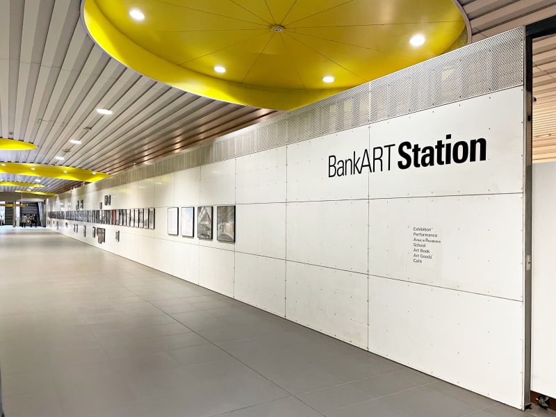 新高島駅構内地下1Fに広がる『横浜BankART Station』もぜひチェックしておきたい場所。壁沿いには現代アートや映像作品などが飾られており、カフェや展示室なども併設されています。