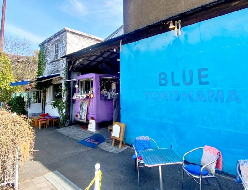 それがお店の外観です。特徴的な青色の壁には「BLUE YOKOHAMA」の文字が書かれており、インスタ等のSNSで人気を集めています。文字の横に立っても、壁の前にある椅子に腰かけても、マリンテイストの写真を撮影できるフォトスポットです♪