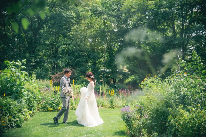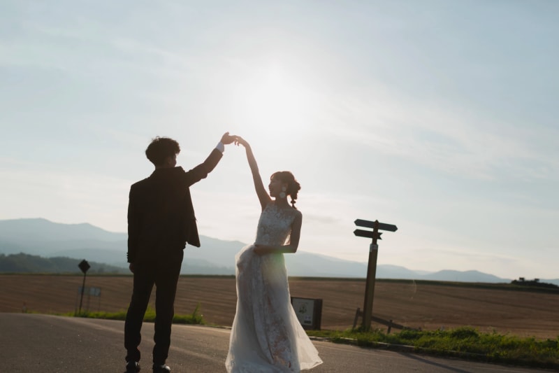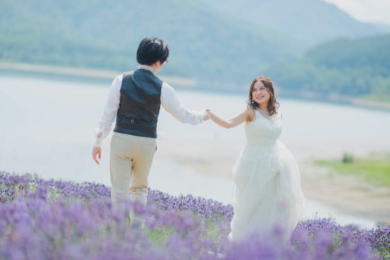 ウェディングフォトをもっと楽しみたい方は、ふたりで手を取り合って踊るように撮影するのもおすすめ。花畑や緑のなかで撮影すれば、動きのあるナチュラルな雰囲気の写真を撮影できます。