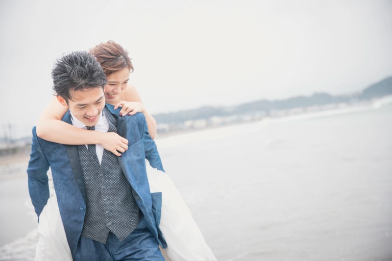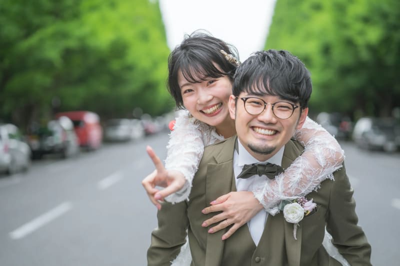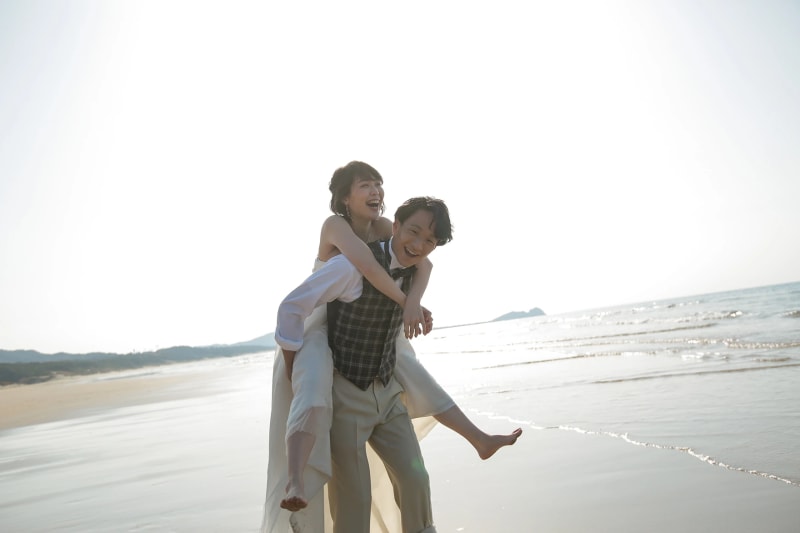一緒に遊んでいるような軽快で楽しげな雰囲気を演出するおんぶのショット。新婦が新郎におんぶされることで、ふたりの親密さや自然な笑顔が引き立ちます。